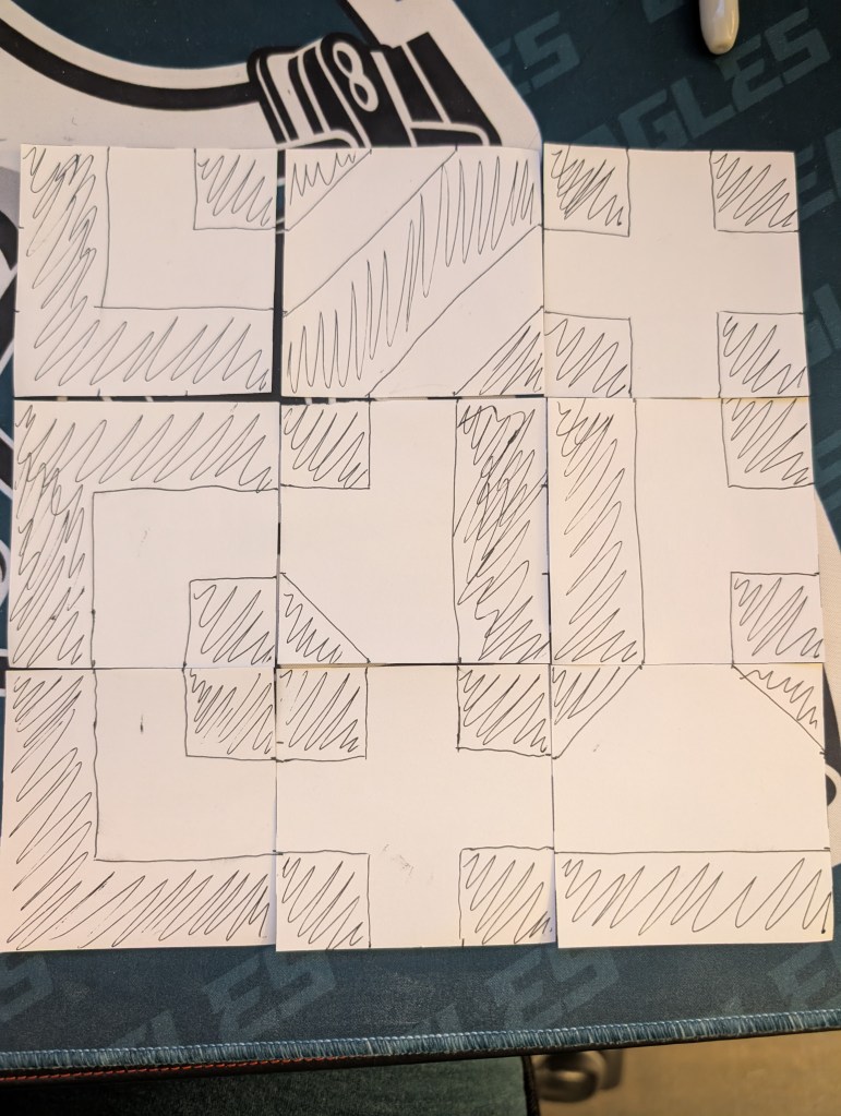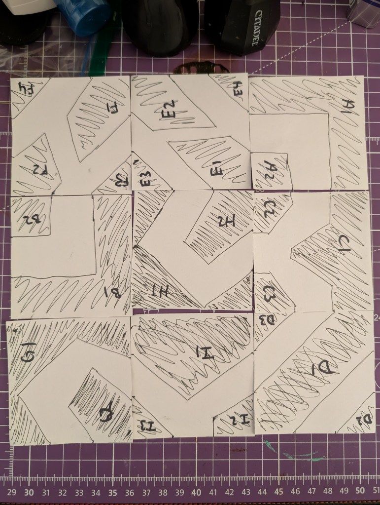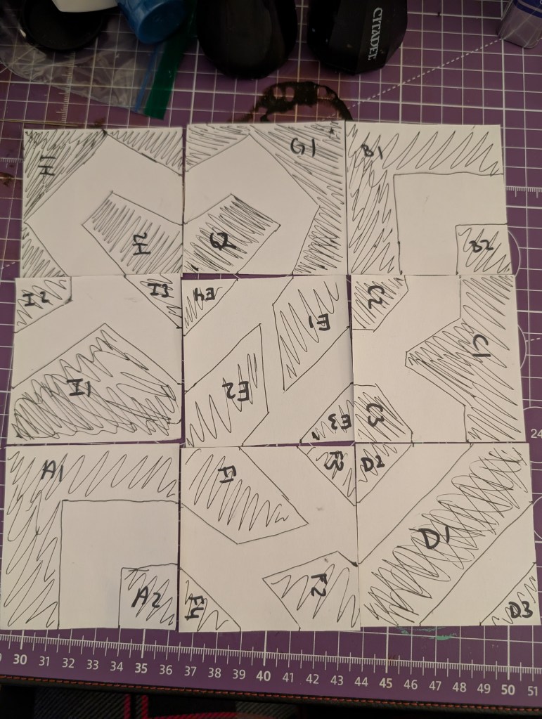 I took some square pieces of paper to represent the tiles and drew out some concepts. The idea is that each trench opening is in the middle of each side and is 4in wide. These early iterations had more straight edges and wide areas. Those were nixed in favor of more confined spaces. The photo on the right shows some possible places for various pieces of larger terrain. When designing the trenches, I wanted to make sure there was still some open area for people to run from one trench section to the next and large enough to have some pieces of terrain. Think barbed wire, bunkers, artillery or crosses.