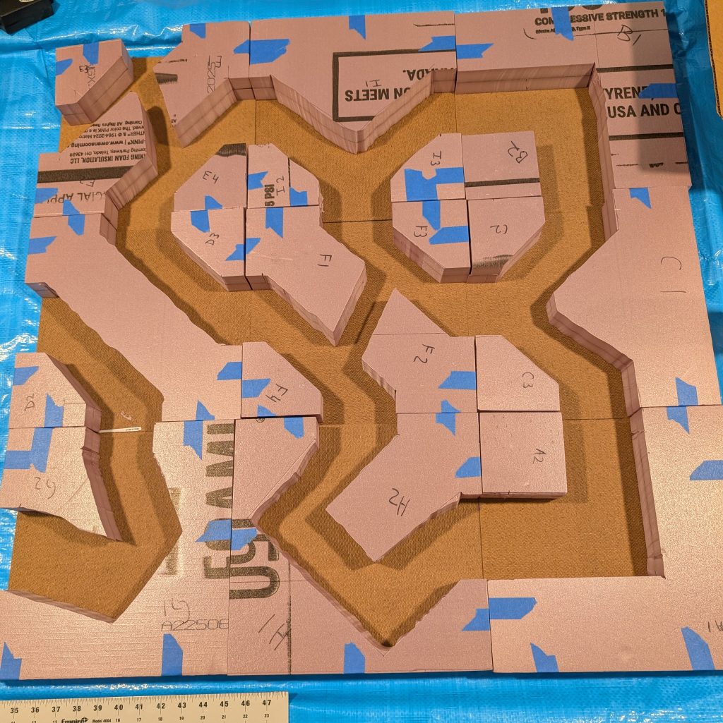 I wasn’t sure how glue would react or cut with the hot wire foam cutter so I used painters tape to hold the pieces together while cutting the trench shapes. Each tile has 4in entrances and each entrance is centered, so 4in of foam on the left and right side of each entrance. Each tile entrance has 1in entry so all the entrances will sit flush. I probably didn’t need to this for future boards, but it felt right at the time.