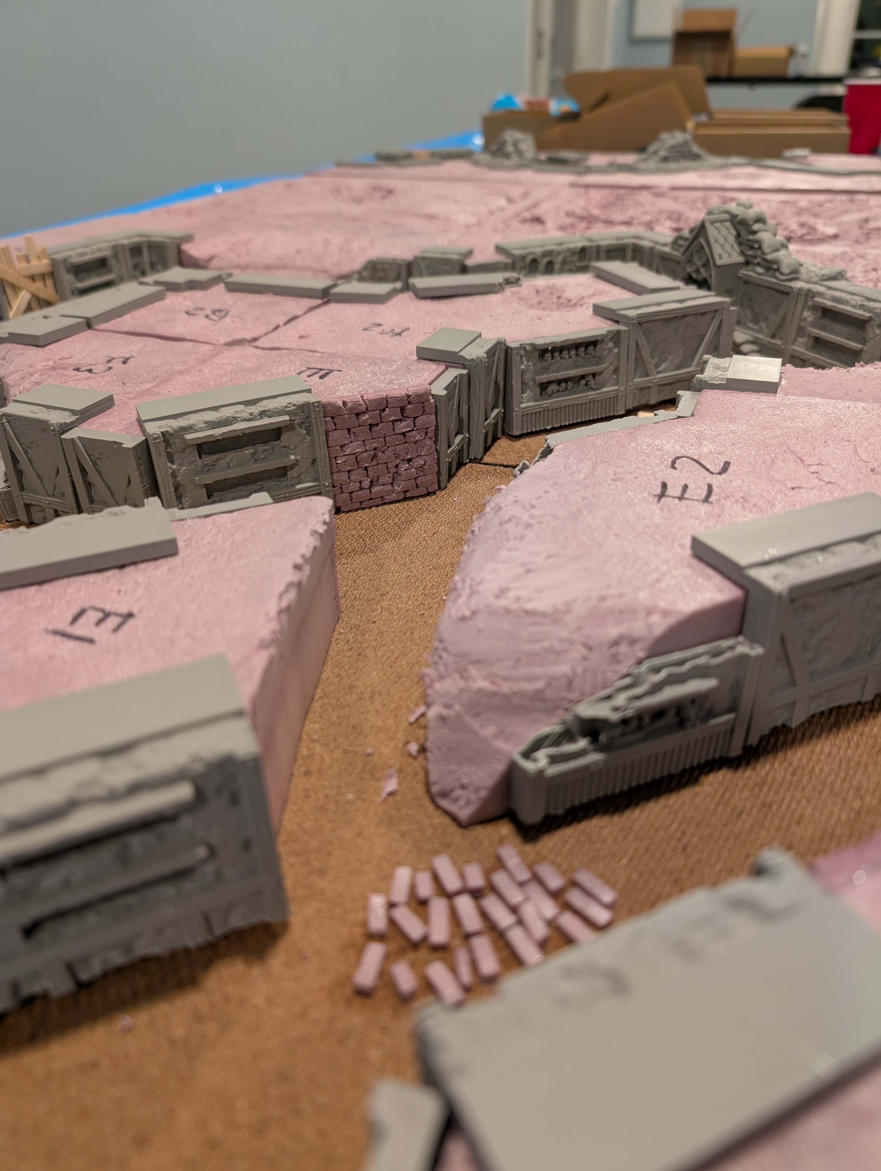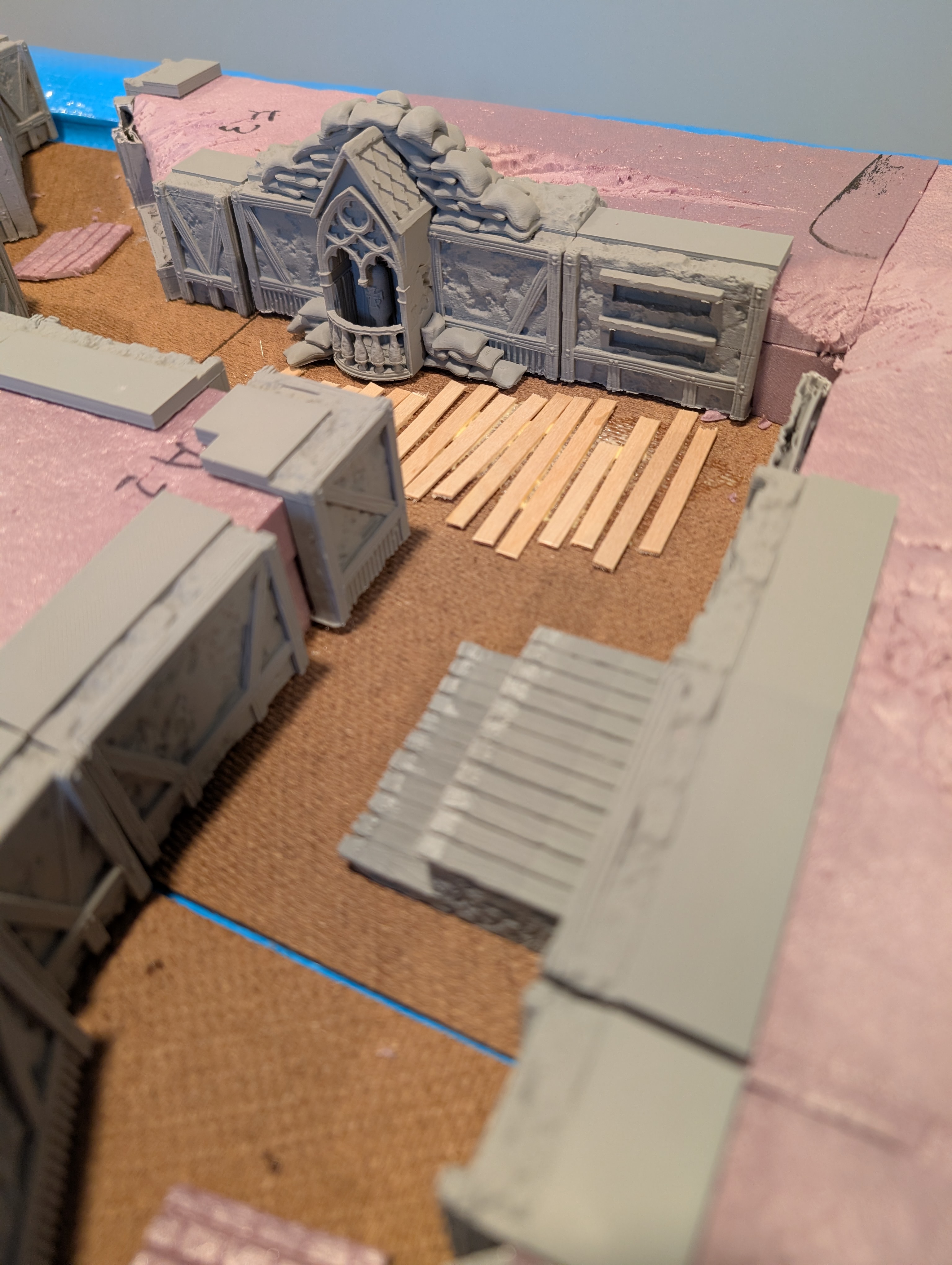 With the foam glued and the walls printed. It was time to dry fit the walls and determine layout and how many more walls were needed. I quickly realized I was going to need more walls… A few days later and I had enough walls to start gluing them to the foam. In hindsight, I should’ve painted the walls first. It is going to be a pain in the a** to get paint in all these nooks and crannies. I also took this opportunity to add duck boards and bricks to break up the dirt flooring and add some extra elements to the walls.